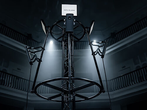 In the domed hall of the former crematorium, visitors were greeted by a symbiosis of both artworks, created especially for the occasion and appealing to different senses. The expansive artwork was the focal point of the otherwise dark rotunda. From a black, artificial pond with eight white swans, the tower seemed to grow out, to which the four primates of the artwork APES were anchored. While in the lower part of the room, in particular, the glowing swans from former satellite dishes and the skyrocketing numbers of cyberattacks, Google searches, tweets, and Instagram uploads on the screens above the monkeys' heads stood out in the darkness, reflections of the water appeared on the ceiling and the walls covered with the urn niches. The visual impressions were accompanied by a special soundscape: The howling of the monkey-like sound sculptures that rattled the tower of trusses was complemented by the "swan song." This was accompanied by rippling water as the swans moved across the dark pond.