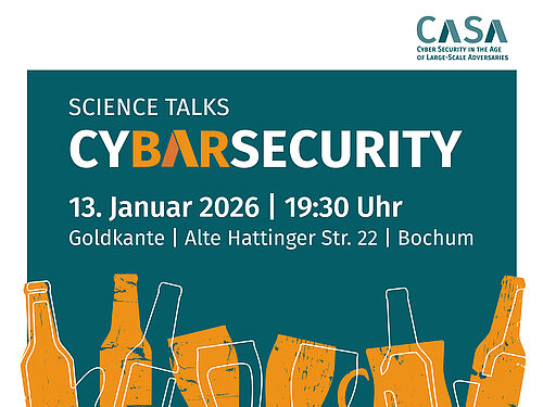 Am 13. Januar um 19:30 Uhr decken IT-Sicherheitsexpert*innen des Exzellenzclusters CASA am Horst-Görtz-Institut für IT-Sicherheit und dem Max-Planck-Institut für Sicherheit und Privatsphäre für euch die unsichtbaren Gefahren des Internets auf. In der vierten Ausgabe der Veranstaltungsreihe sind unsere Forschenden zu Gast in der Bochumer Bar „Goldkante“, um exklusive Einblicke in aktuelle Themen der Bochumer Cybersicherheitsforschung zu geben - für Laien verständlich und in lockerer Baratmosphäre.